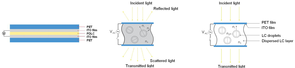 By applying the power control, the Polymer Dispersed Liquid Crystal film can swiftly change from clear (On) and opaque (Off).